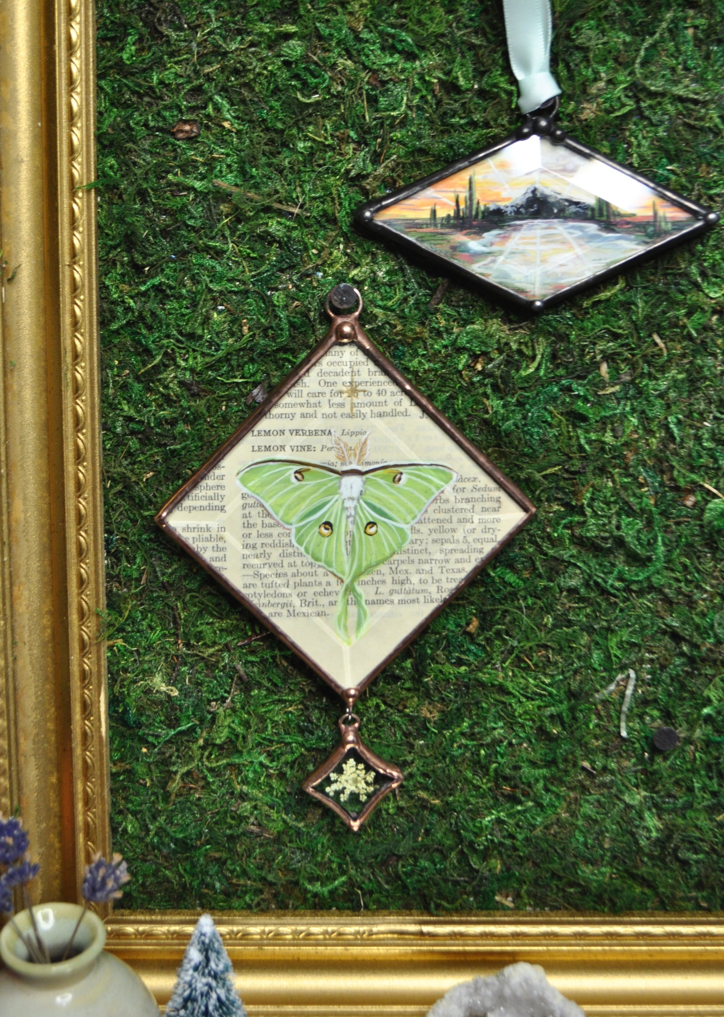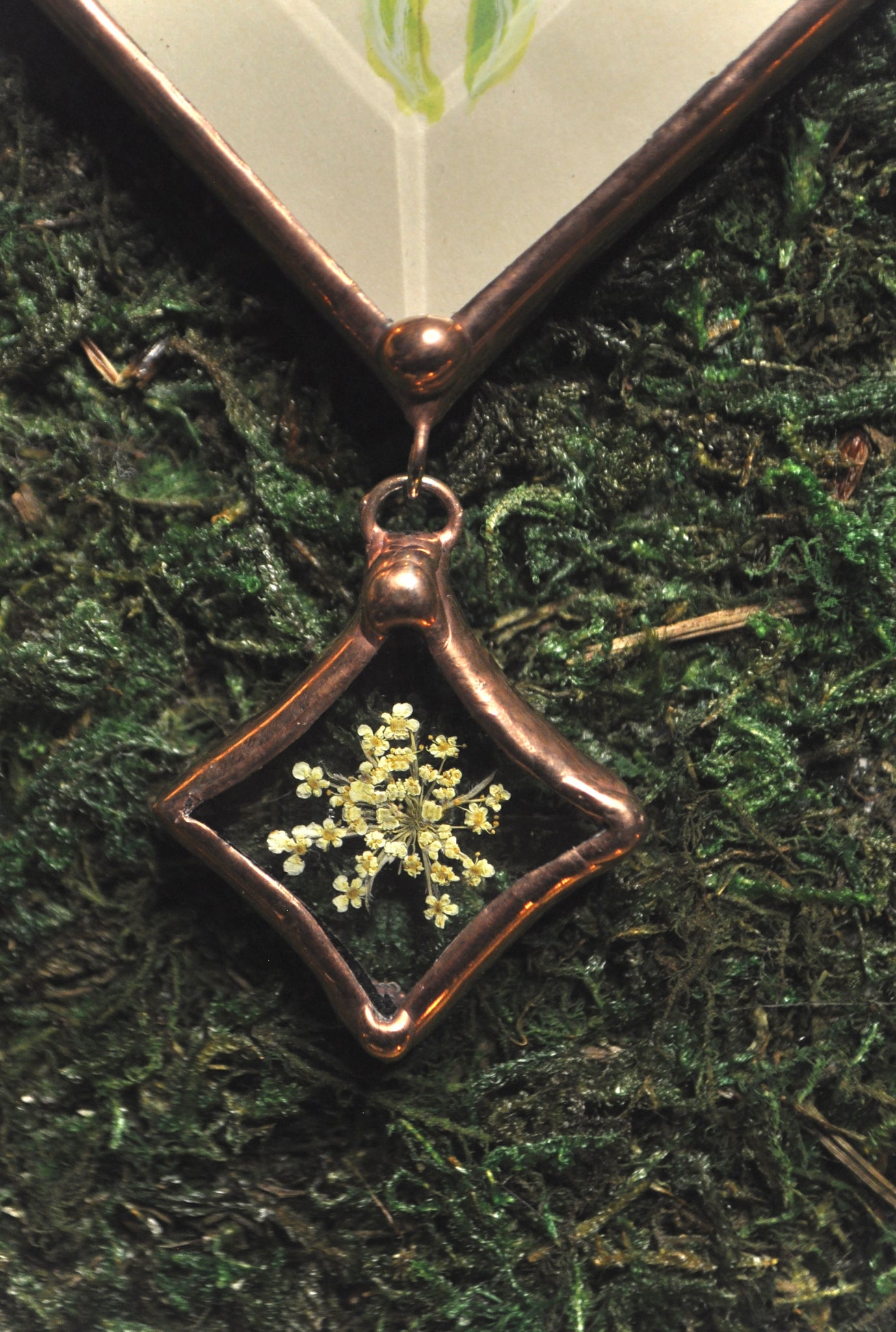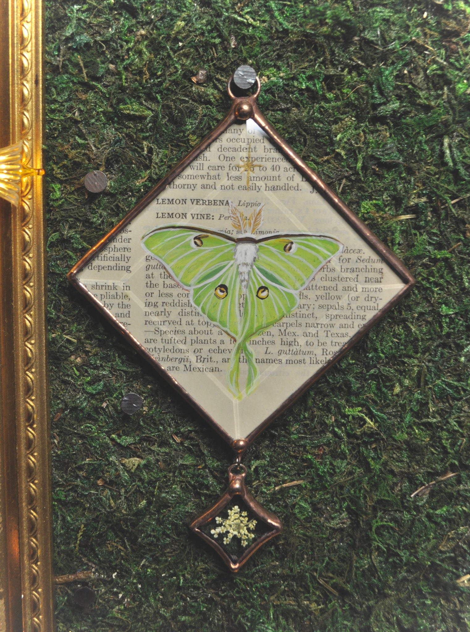 Gouache paint on vintage botanical encyclopedia page encased in beveled glass with hanging star bevel and pressed wild carrot.