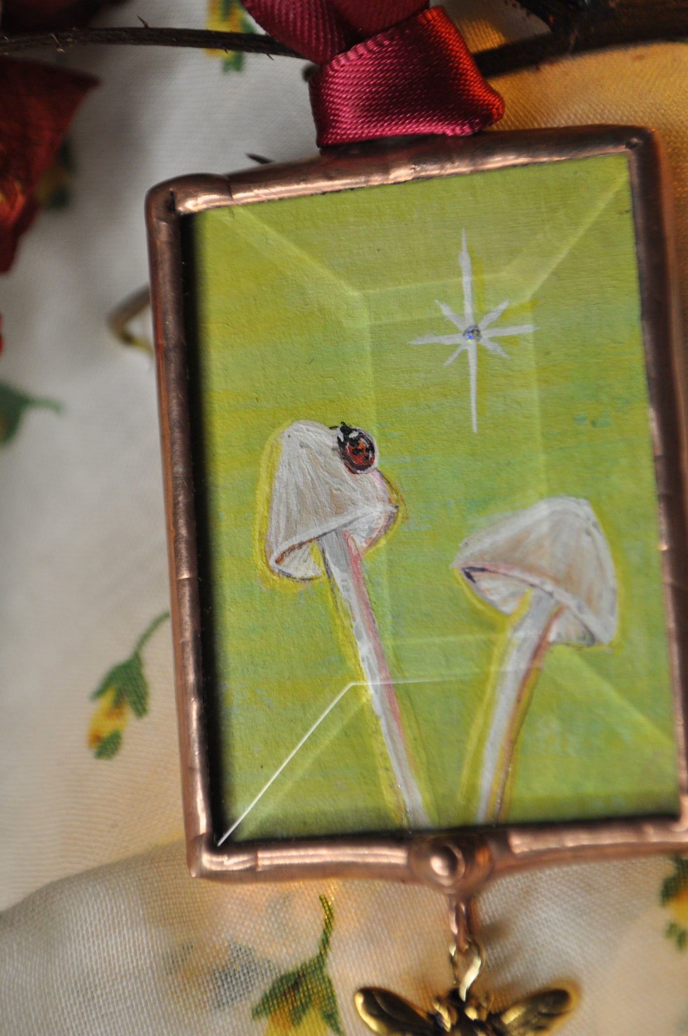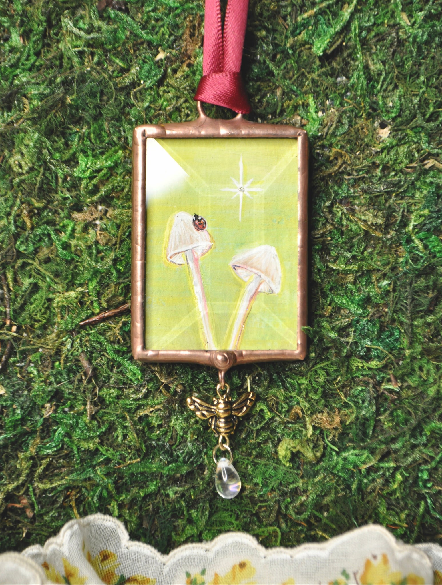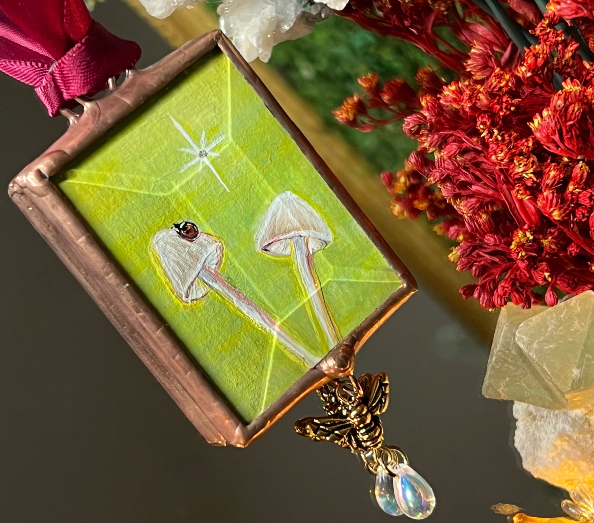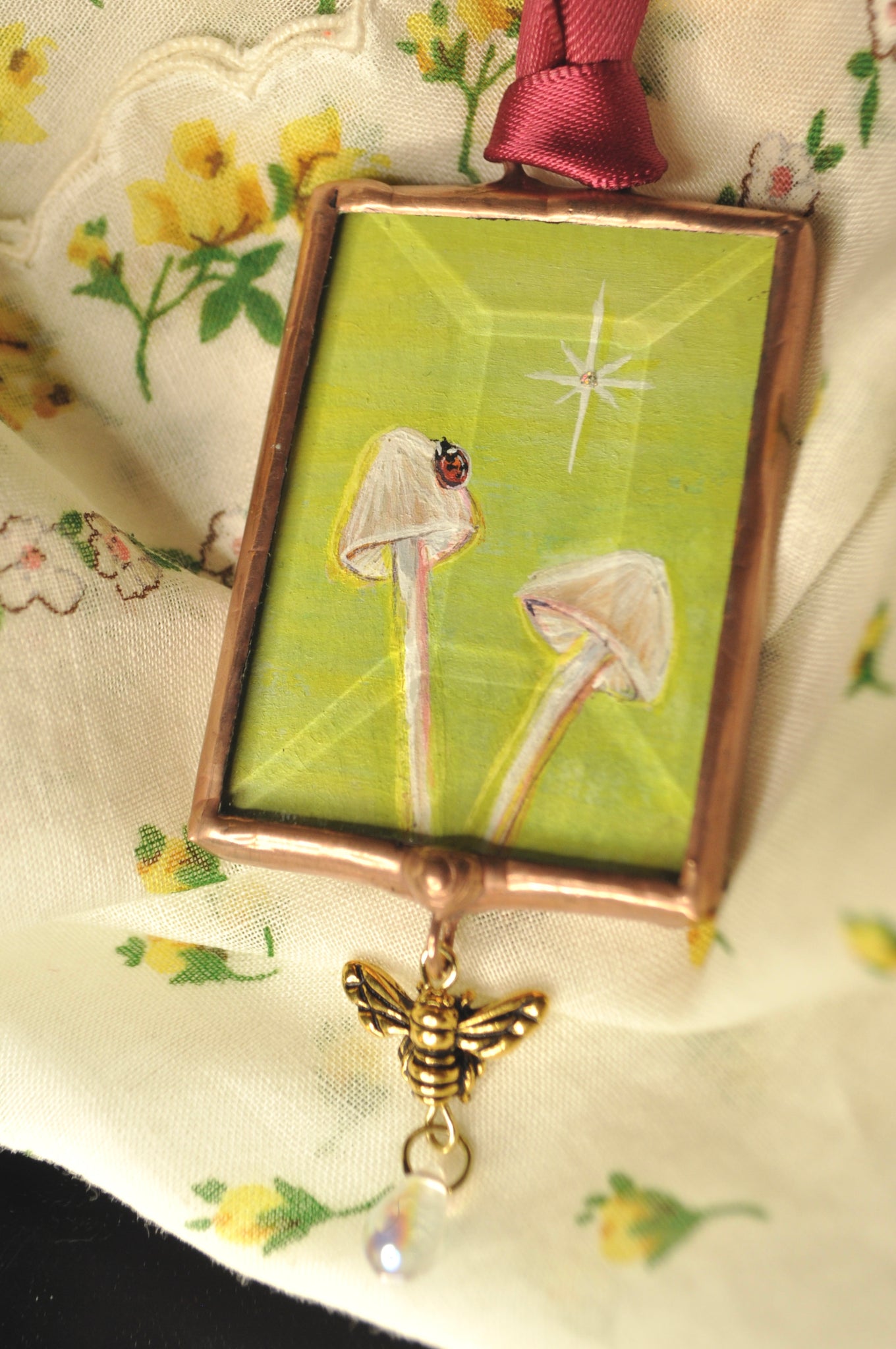 Gouache paint on paper encased in beveled glass with hanging bee and moonstone.