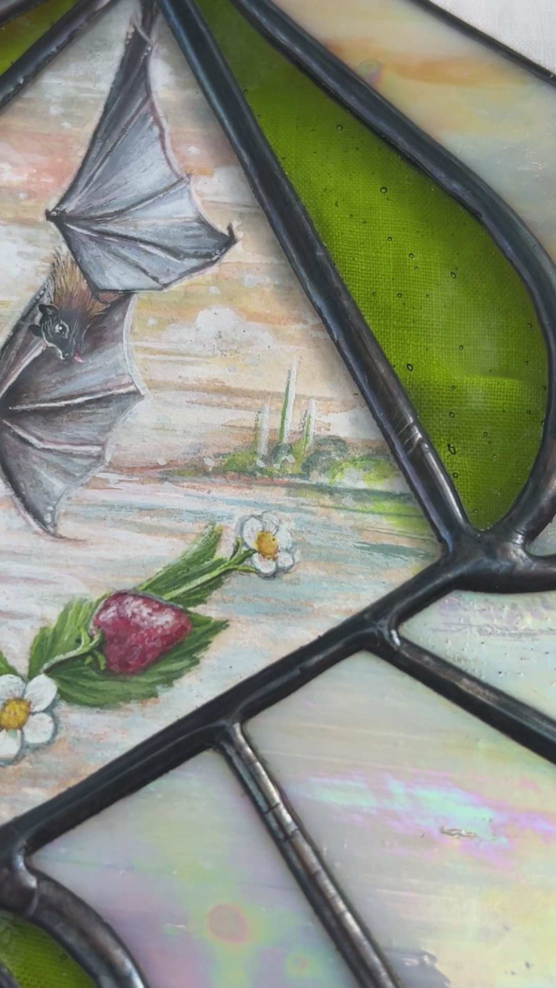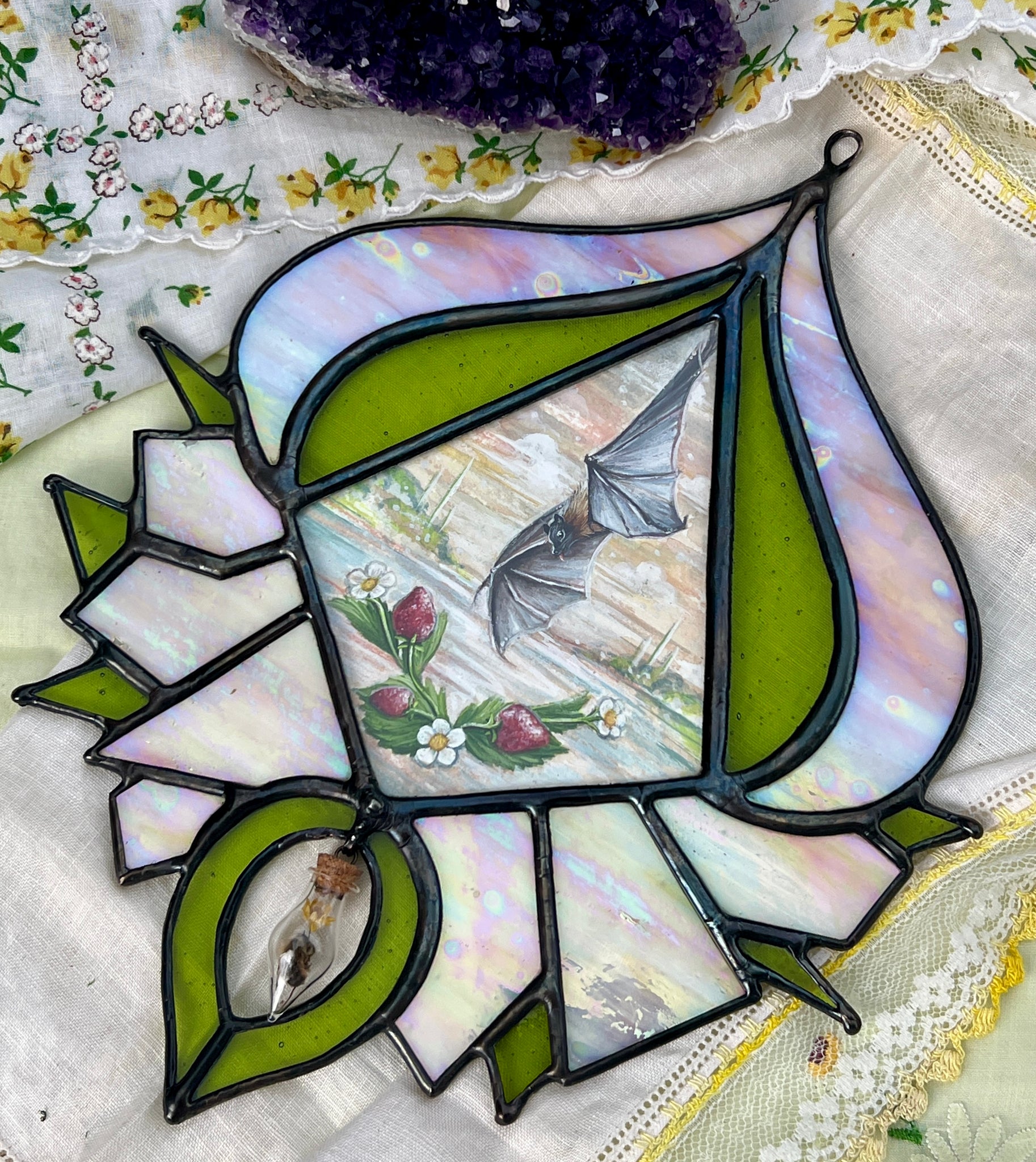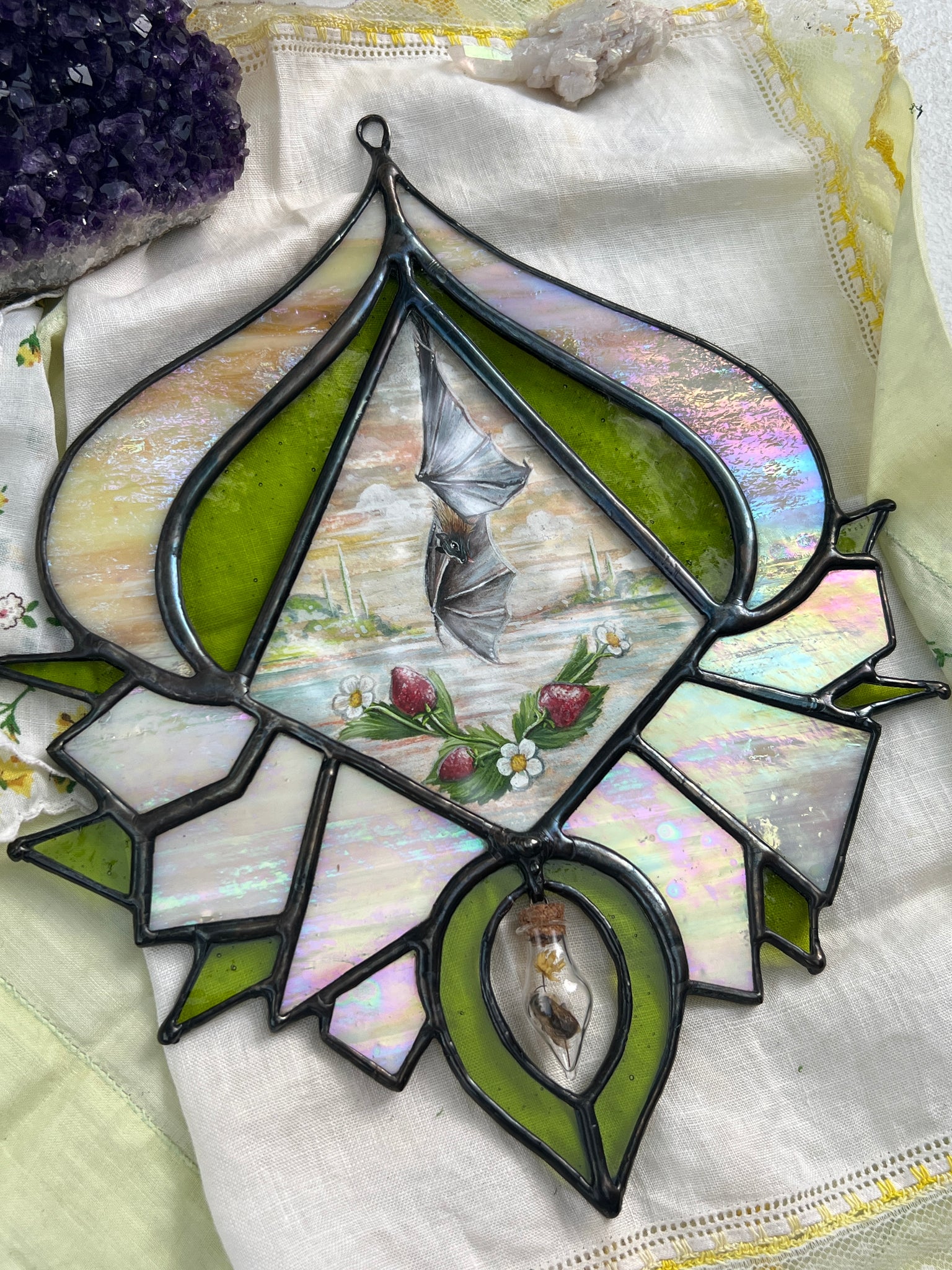 Gouache painting on paper set between glass. Iridescent glass and light green glass. Hanging vial.