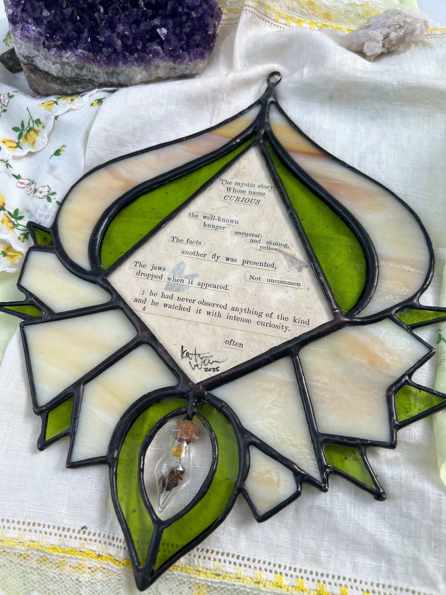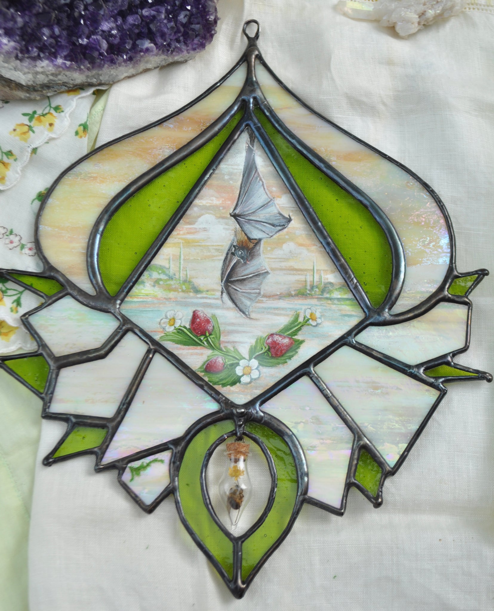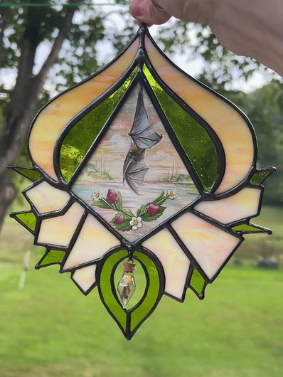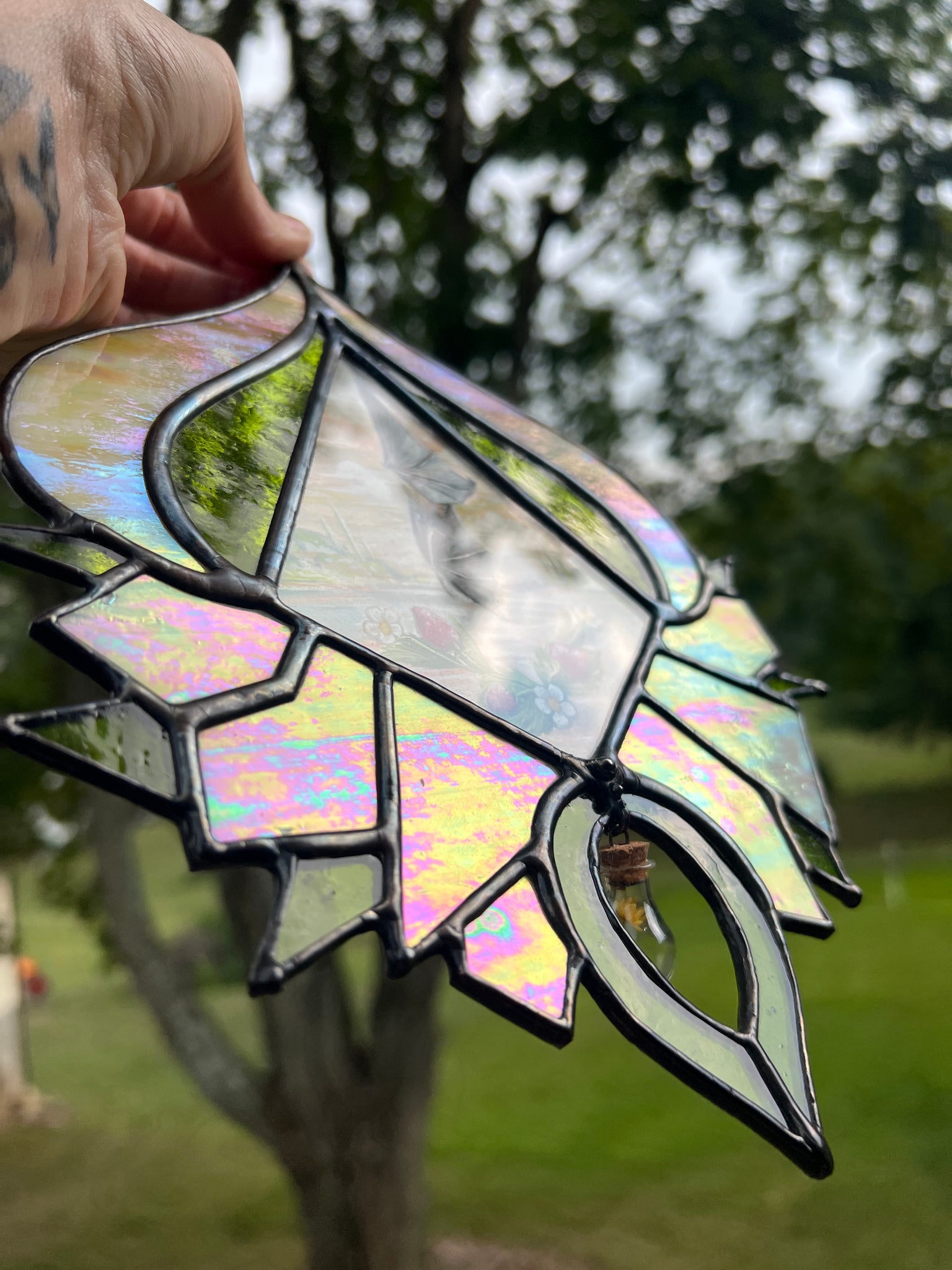 Gouache painting on paper set between glass. Iridescent glass and light green glass. Hanging vial.