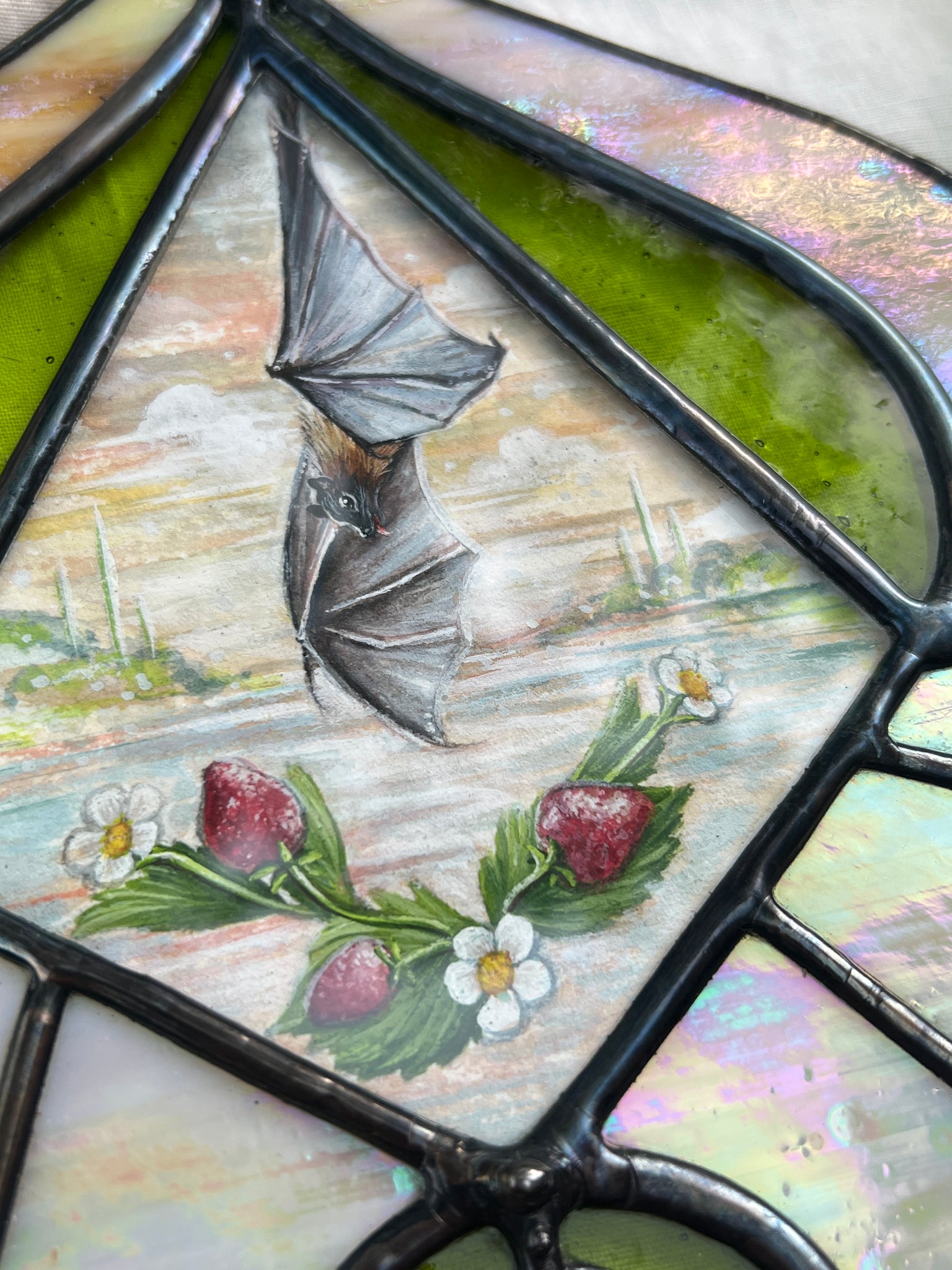 Bat and strawberries in landscape + found bee w/flower (studio, 2025)