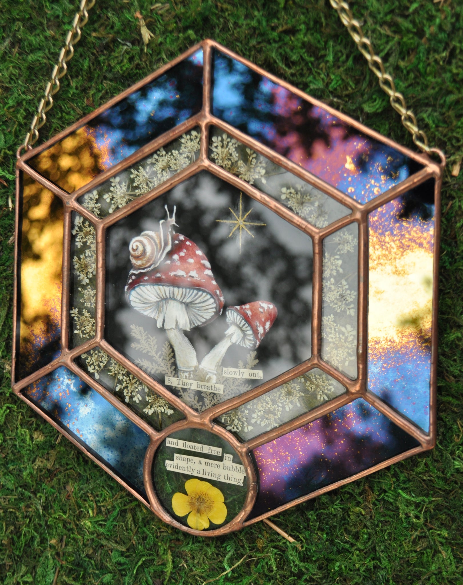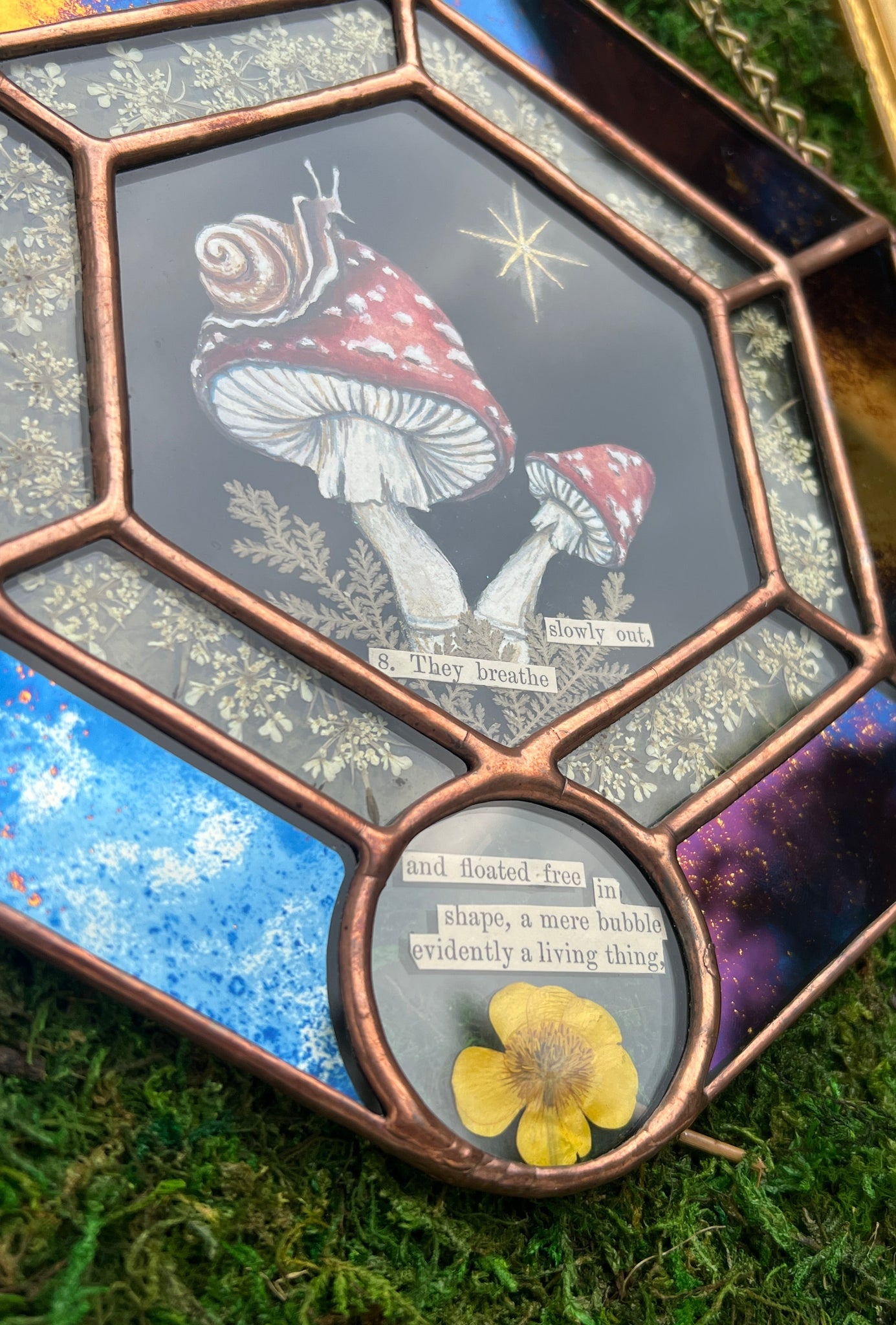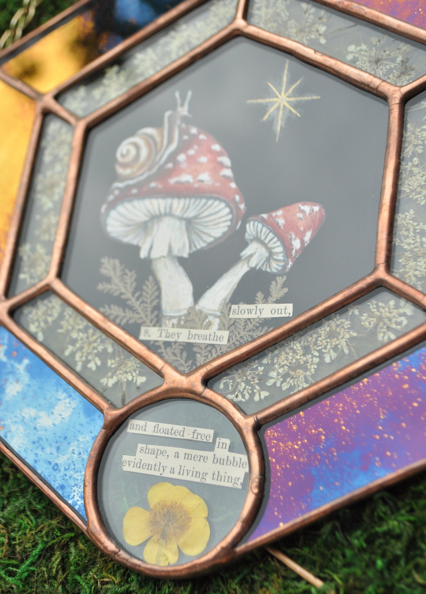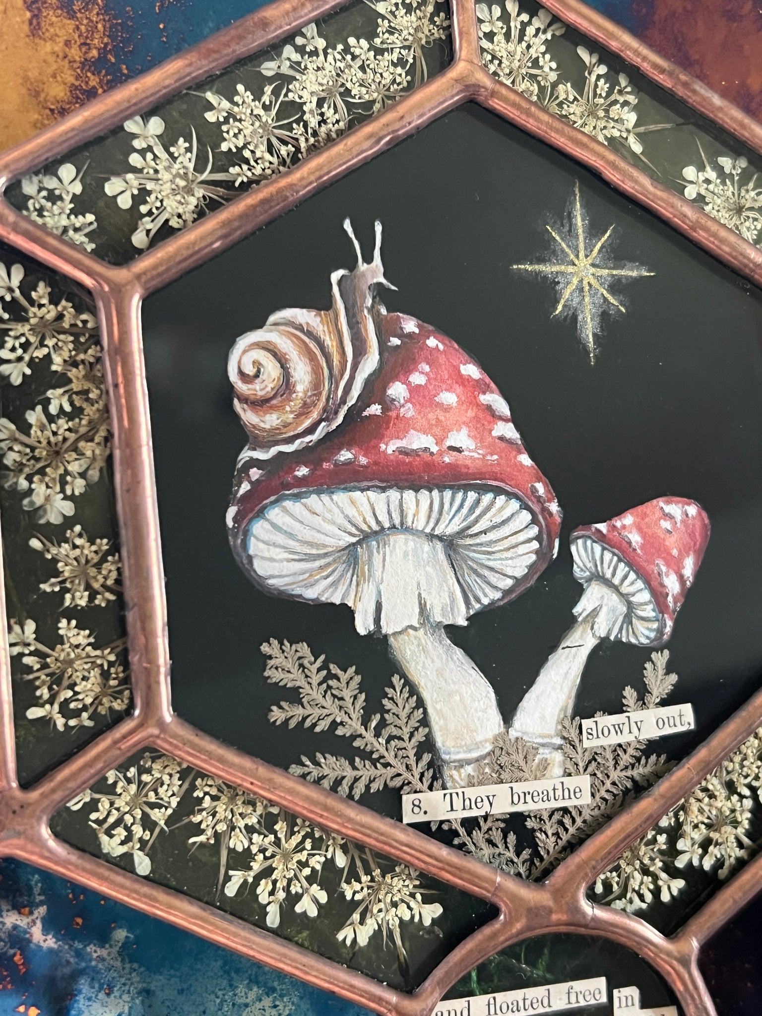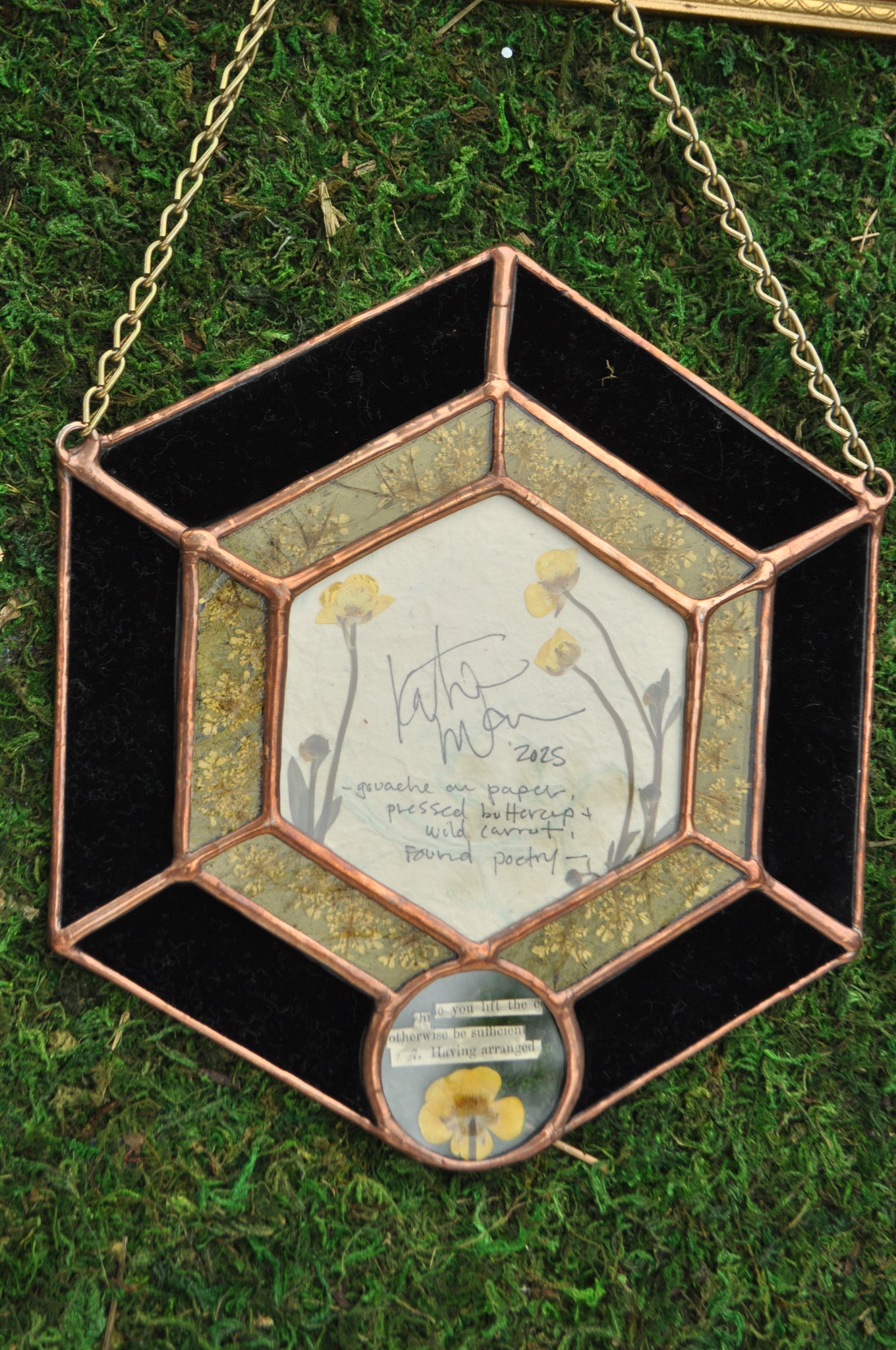 Gouache painting on paper set between glass + pressed Queen Anne’s Lace and Buttercup. Mirrored glass glass border.